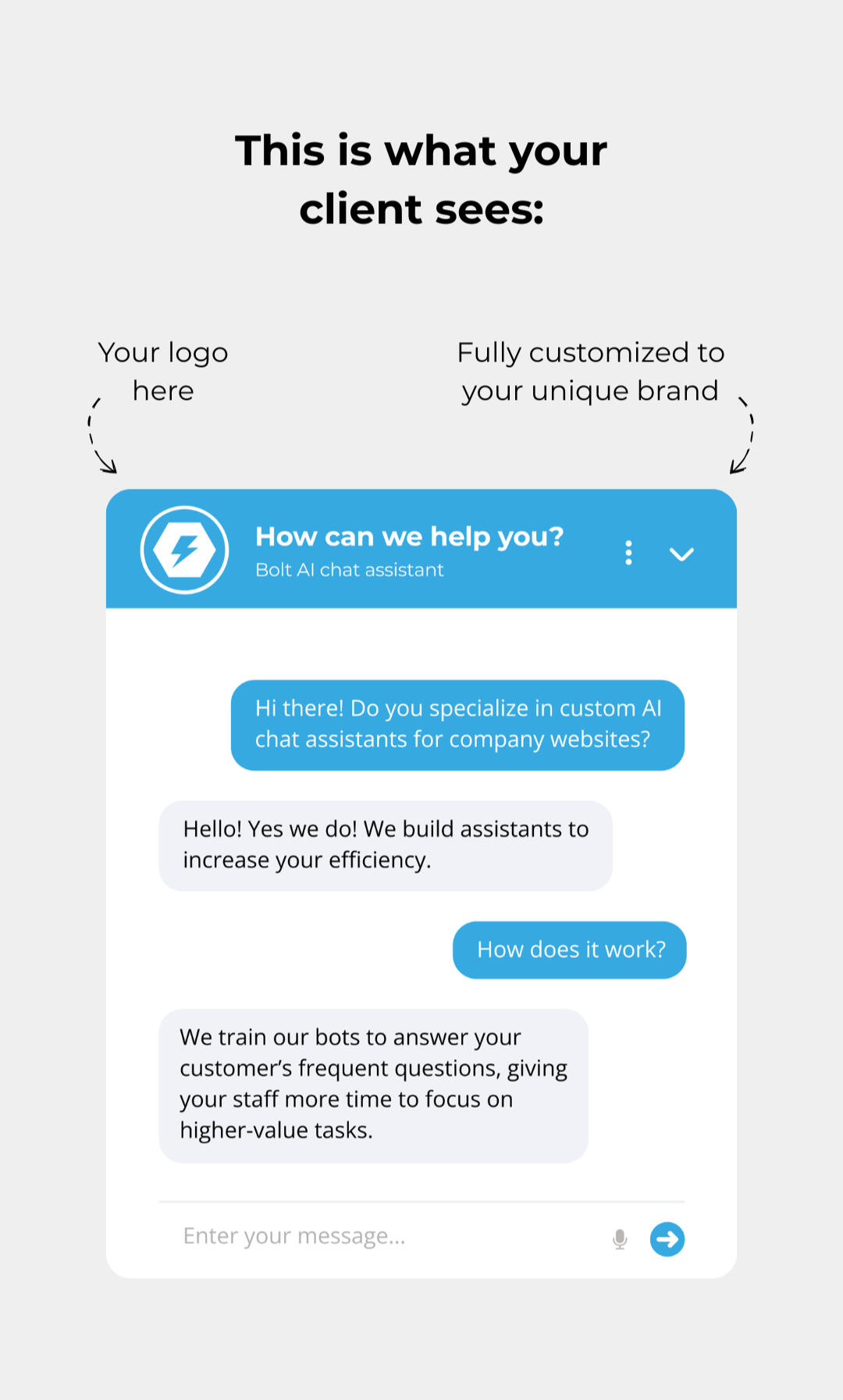 Once you receive the AI assistant and install it on your website (we can help with this part) it will instantly be ready to have conversations and answer your clients' questions.